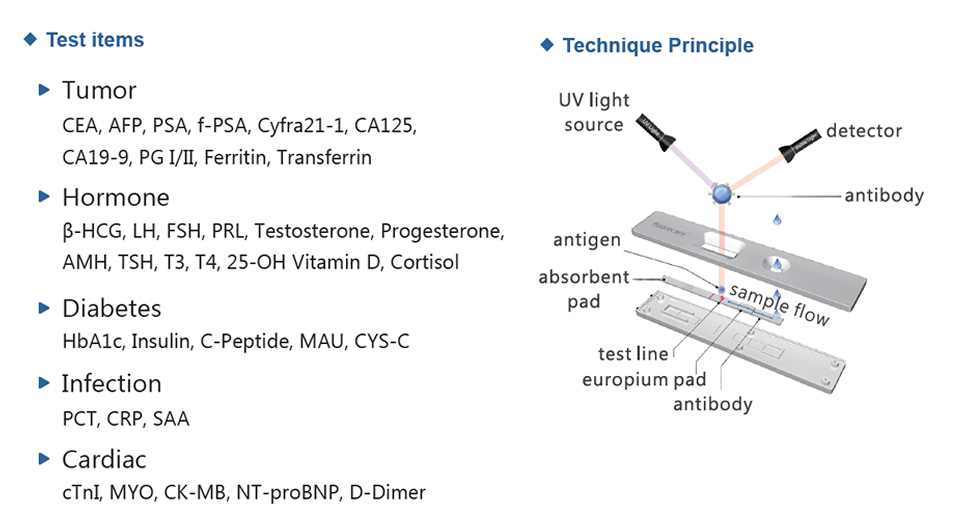 Microprofit fluorecare Immunofluorescence Quantitative Platform uses immunochromatographic technology aimed at the diagnosis of common human diseases. Based on the specific antigen-antibody reaction, the triggered fluorescence of the fluorochrome-labeled complexes is summed and calculated automatically. For specific analyte including serum, plasma, urine or other samples, fluorecare can measure the concentration of various biomarkers, including tumor markers, hormone markers, infection markers, cardiac markers and diabetes markers, with excellent accuracy and easy operation.